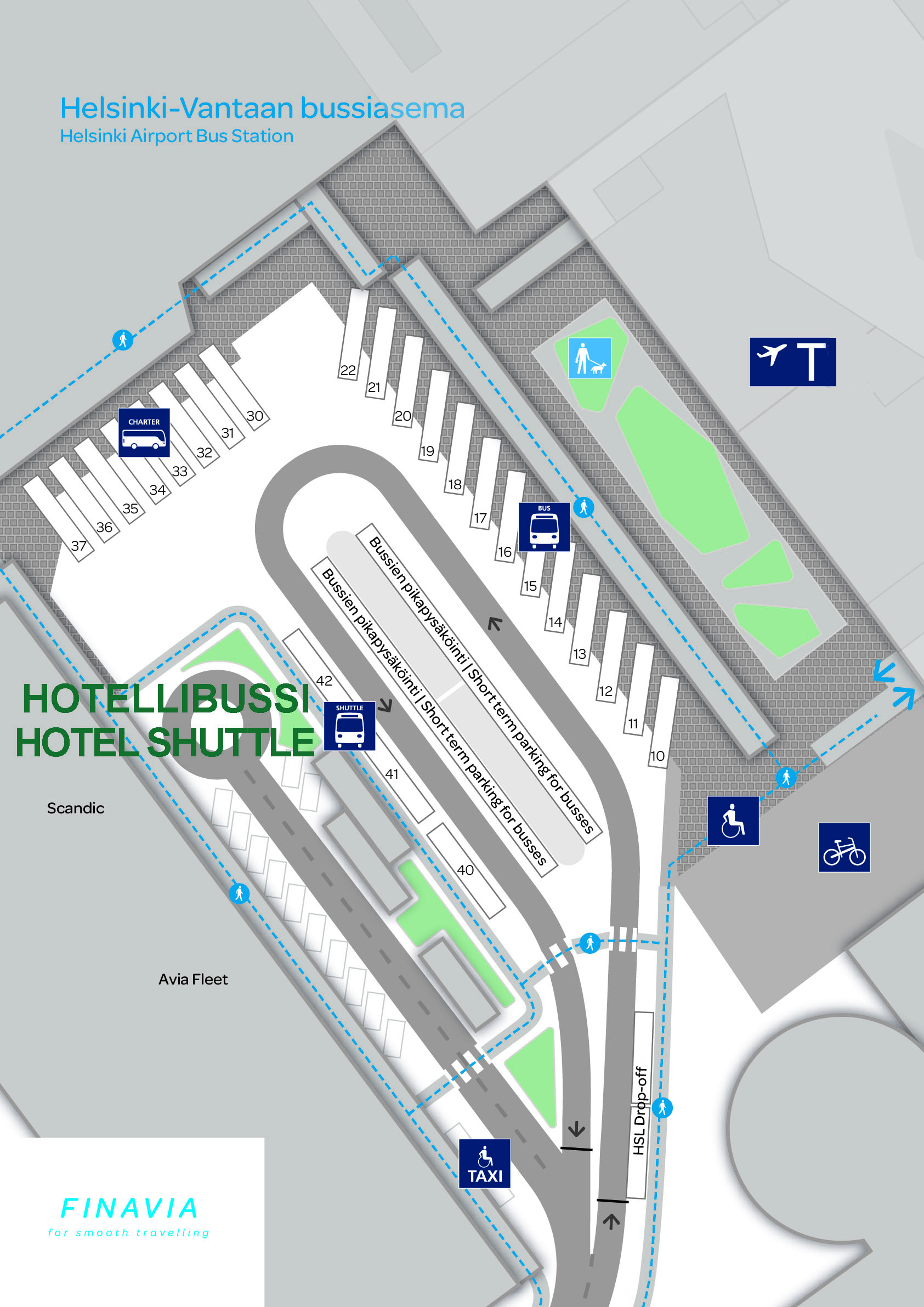 The airport shuttle’s stop is platform 42 in Terminal 2. See map (pdf)
